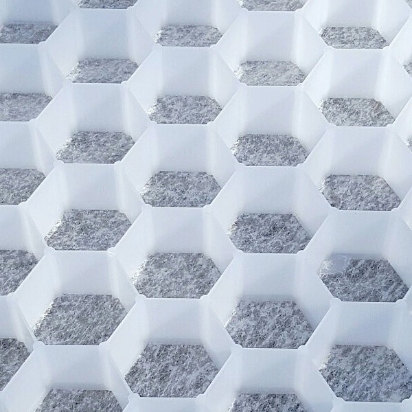 La plaque alvéolée est constituée d'une structure de cellules hexagoneales en nid d'abeille 100% polypropylène haute résistance, thermo soudée à un géotextile non tissé 100% haute densité.
